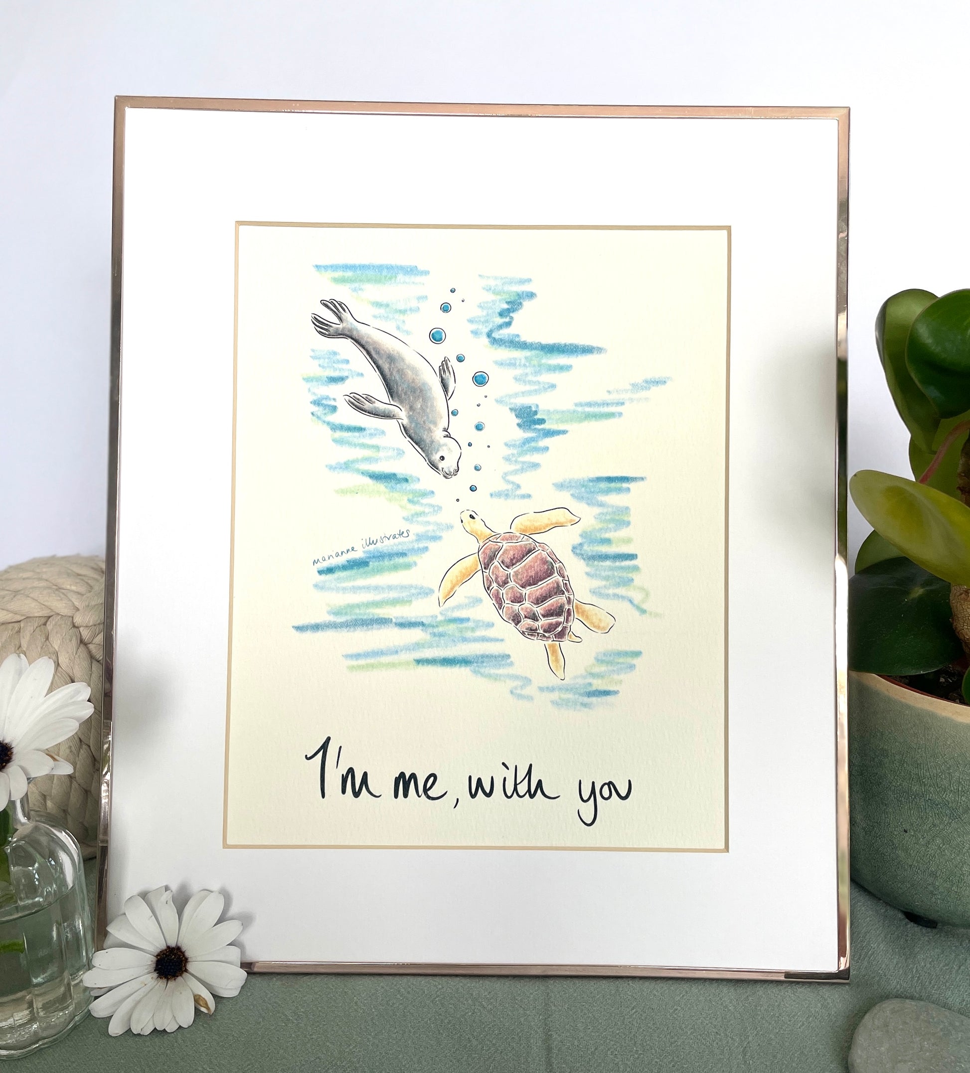 A beautiful hand-drawn art print featuring a seal and turtle coming together to connect underwater. The message 'I'm me, with you' is handwritten in Marianne's signature loose style.